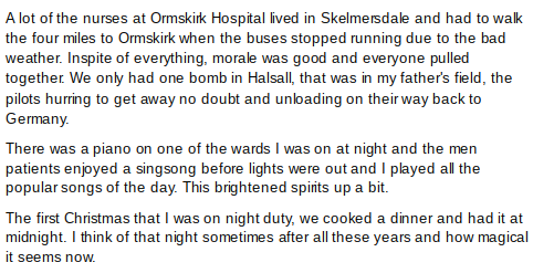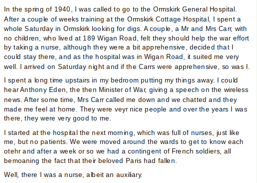 Ida Lowe (later Lloyd) GPC1-3G4 who lived at Watson House, Summerwood Lane worked at Ormskirk hospital for the Auxiliary Nursing Reserve. She describes her time there …