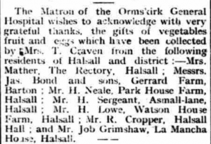 On a more local level, Hilda Lethbridge (Biography) G47M-Y9Q of La Mancha Hall in Shirdley Hill was the head of the Halsall Division assisted by Natalie Spence (Biography) G5J1-BRB of Halsall House, the Shaw ladies GKH6-V2B from Shirdley Hill railway station, Alice Dickinson 9JN3-B47 from the Scarisbrick Arms and Barbara Grimshaw G5JC-R9W from La Mancha farm.