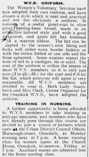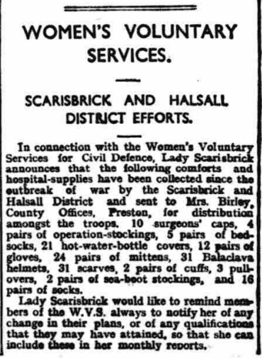 For the purposes of this article, research into the 1939 Register for Halsall was conducted and the following table produced. Any resident who had become a member of the WVS, St. John’s Ambulance, Special Constables, Auxiliary Nursing Reserve, Auxiliary Fire Service and ARP Wardens were recorded on the 1939 Register. No mention was made of Land Army girls or Home Guard members. Evacuees are only occasionally highlighted and are listed on our 1939 Operation Pied Piper page.