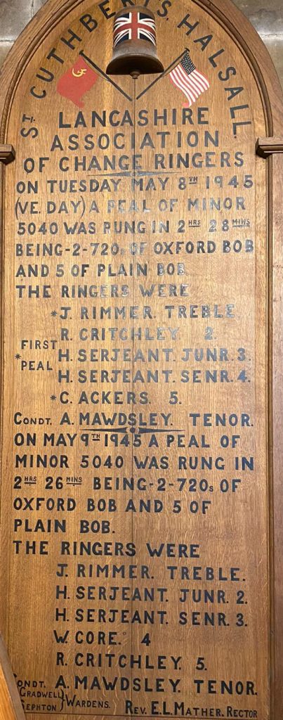 The bells of St. Cuthbert’s church rang out throughout Halsall on the day of 8th May 1945 – V. E. Day. The relief and joy would have also been met with sadness, mixed emotions and exhaustion, no doubt. Nevertheless, the peal of bells signified the end of war in Europe and an opportunity to celebrate.