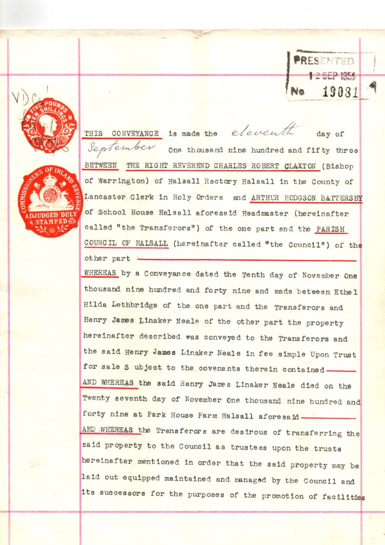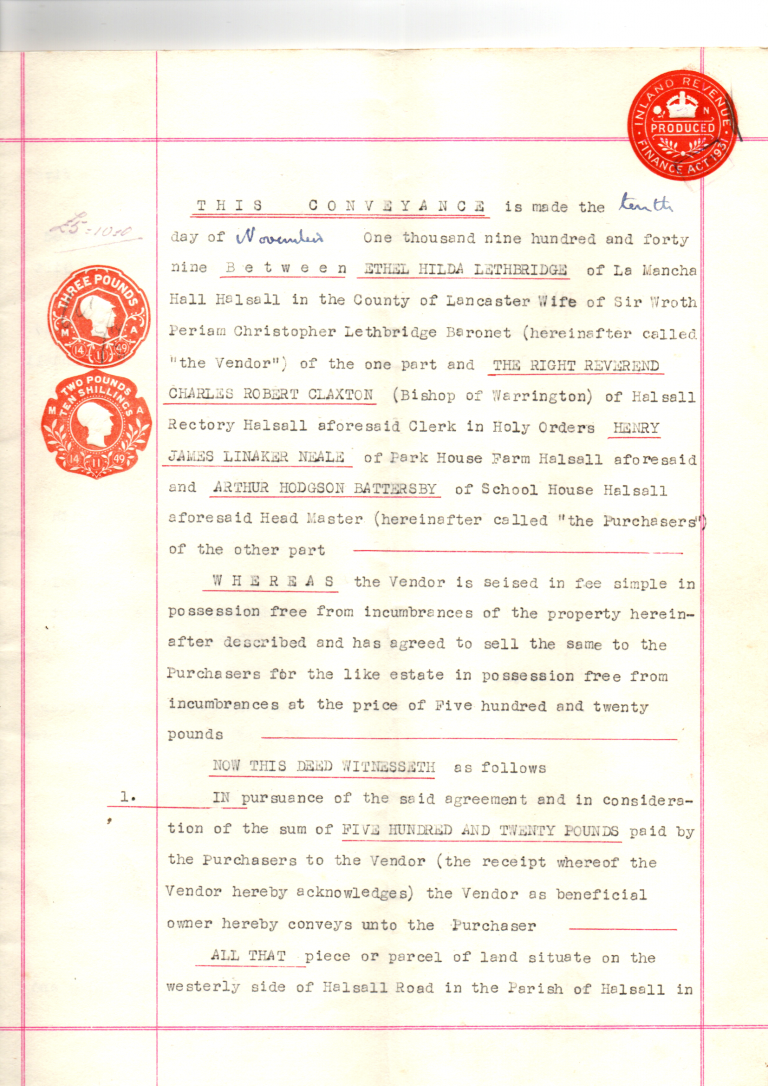 In 1949 Lady Lethbridge, who was now living at La Mancha, sold the land to a partnership of Reverend Charles Robert Claxton (1902-1992) [G26G-385], Henry James Linaker Neale (1905-1949) [GX26-FCH] and Arthur Hodgson Battersby (1892-1971) [LBZL-K9P] for £525 pounds. These were the representatives of the residents of Halsall who had raised the funds to purchase the land by public subscription.