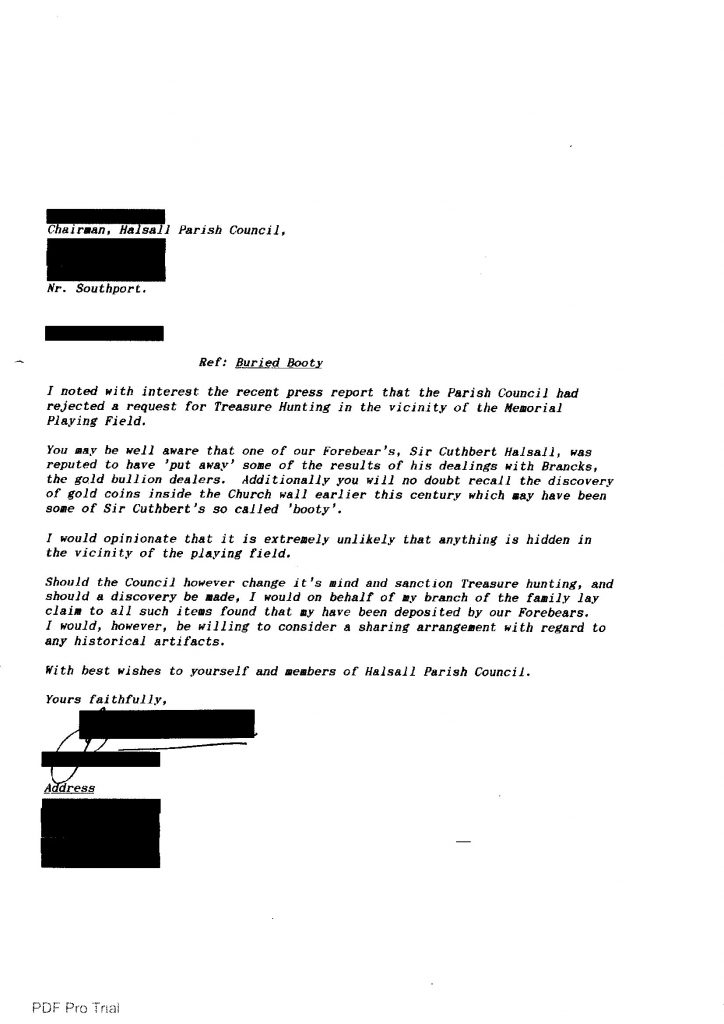 In 1991 there were rumours that a “Sir Cuthbert Halsall” had bought gold from bullion dealers and hidden it, some had been found at the Church and some might be under the field ? The Parish Council refused permission for metal detecting and did not accept a claim from a descendant of “Sir Cuthbert Halsall” that anything found in the field belonged to them.