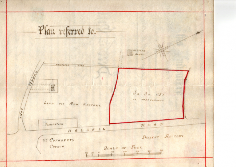 On 26th January 1905 Henry, known as Colonel Blundell, transferred half of the land, just over 5 acres, the current playing field, to his brother Reverend Thomas Blundell Hollinshead Blundell (1834-1905) [MHP1-FLL] , the Rector of St Cuthbert’s in Halsall.