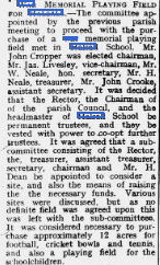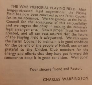 A Charity was set up to manage the playing field and a village hall, ”The Memorial Hall”, was built. The transfer was reported in the Parish Magazine.