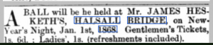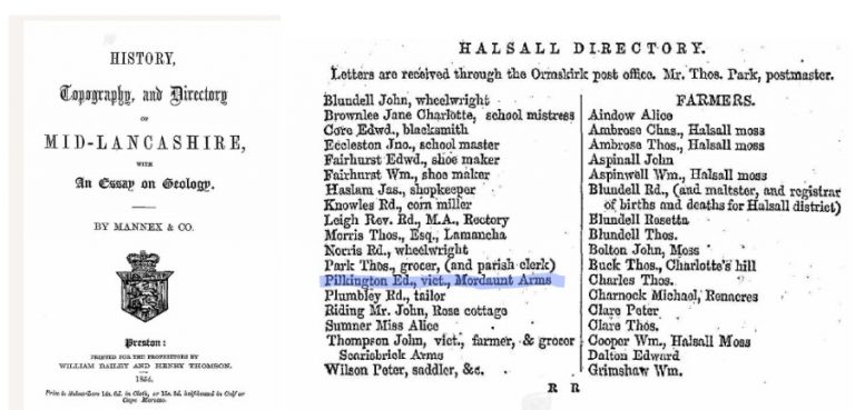 In 1854, according to the Mannex & Co. Directory, the inn by the Warehouse Bridge was called the Mordaunt Arms presumably after Charles Lewis Mordaunt, JP (1729-1808) KFR4-41P who lived at Halsall Hall and owned Halsall Cotton Mill. The directory shows Edward Pilkington as innkeeper at the Mordaunt Arms in 1854.