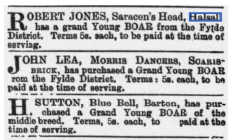 As a sideline, Robert Jones, as did many other publicans including his neighbour, Harry Sutton at the Blue Bell owned a boar to make some extra income – see the advertisement which appeared in the Ormskirk Advertiser on 5th October 1899.