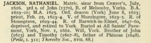 Nathaniel Jackson KZHT-X7Q was a Yorkshire man – born c.1598 to Reverend John Jackson and his wife (name unknown). He was the youngest of three boys – his brothers being Timothy and John, both of whom were also ordained ministers.