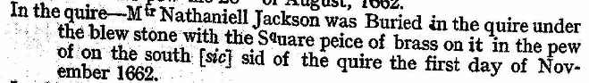 Reverend Jackson, retired to York at this point in time. Sadly, he died two years later and was buried on 1st November 1662 at All Saints’ Church, Pavement, York.