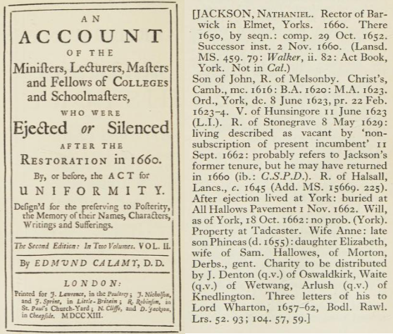 The ‘Great Ejection’ as it was known is explained in more detail in Arnold Gwynne Matthews, ‘Calamy revised: being a revision of Edmund Calamy’s account of the ministers and others ejected and silenced, 1660-62’ (1934 edition). This can be accessed via the Internet Archive (free registration) This 1934 edition being a revision of Edmund Calamy’s original account from 1713.