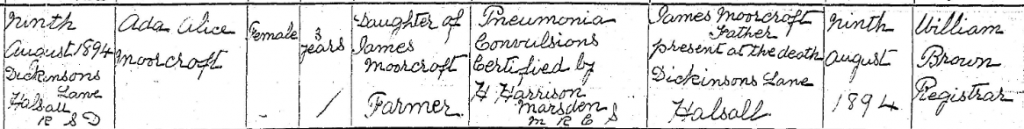 Ada Alice Moorcroft and William Moorcroft were twins born in 1890 to Elizabeth and James Moorcroft. They were both baptised on 29th October 1890 at St. Cuthbert’s church, Halsall. Sadly Ada Alice passed away at home on 9th August 1894 aged just 3 years and 9 months. Her death certificate states she died of pneumonia convulsions. Two days later she was buried with her grandfather, Henry Woodcock at St. Cuthbert’s church.