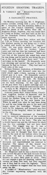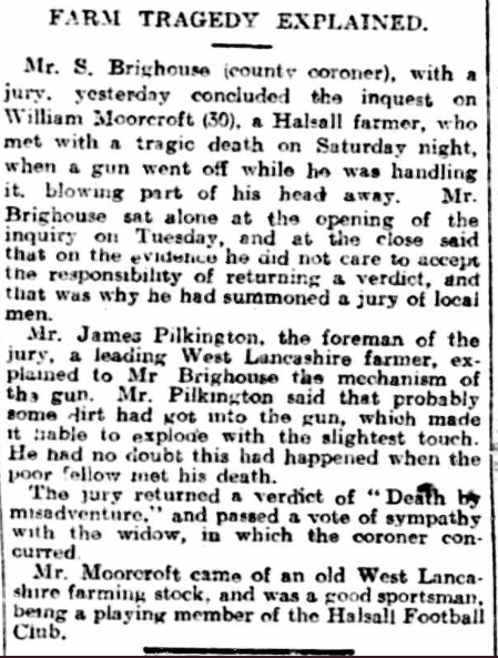 The newspaper cutting from the Ormskirk Advertiser details the inquiry that was conducted at The Ship Inn concerning the death of Mary Jane Moorcroft.