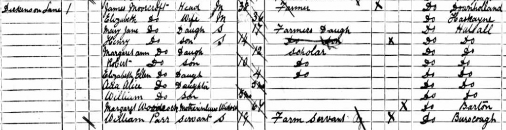 The 1891 census shows the Moorcroft family living at Dicconson’s Farm, Halsall. James, Elizabeth and their 7 children are all listed – this is the only time the whole family appears together on a census record.
