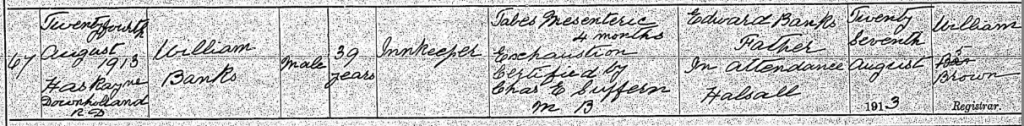 Unfortunately, just two years later, William Banks became ill and he passed away on 24th August, 1913 (which was his sister-in-law Margaret’s birthday). On his death certificate, the Registrar (William Brown of Rose Cottage, New Street) stated the cause of death as being ‘tabes mesenterica and exhaustion’ (a type of tuberculosis).
