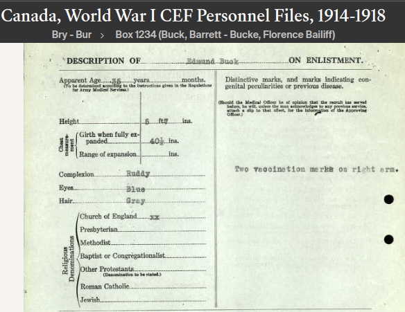 Edmund did not return to England at this time however. By 1915, he was in Canada – we know this as on 14th May of that year, he was recruited by the Canadian Overseas Expeditionary Force, at the age of 35 years old.