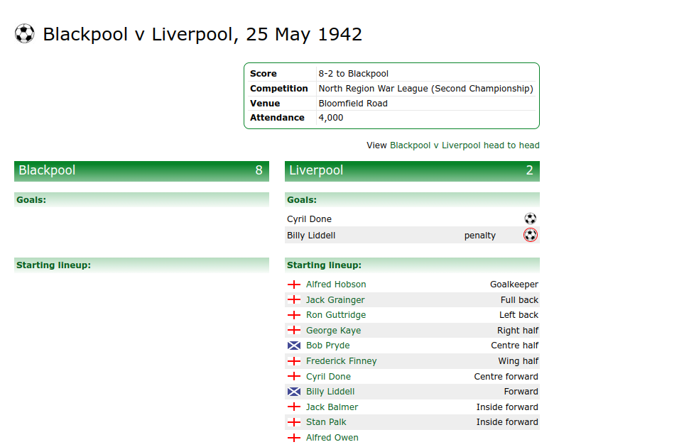 On 25th May 1942, Jack played as a guest for Liverpool FC in the North Region War League; this was common practice at the time if professional football clubs were short of players due to the fact that some of their men had been called up to fight for their country.