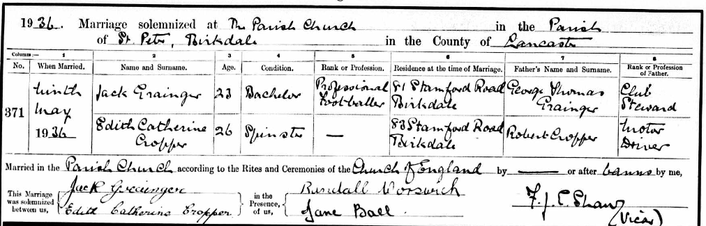 In the 1939 Register for England and Wales which was taken at the beginning of WW2, Jack and Edith Grainger were living at 35 Moss Road, Halsall. Jack’s occupation was given as a professional footballer.