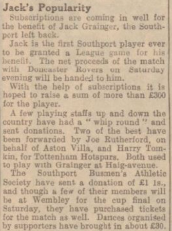 During this season, on 30th April 1939 he was granted a benefit match, receiving £242 (according to the Bank of England inflation calculator this is approximately the equivalent of £13,473.91 today).