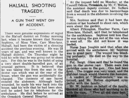 One Autumn evening Norman decided to go out into the garden and shoot some of the rats that had been plaguing his poultry stock. He approached his van which was parked at the back of the cottage and retrieved his gun. Unfortunately, Norman didn’t realise the gun was loaded and as he picked it up, he touched the trigger and shot himself in the abdomen. Staggering to the cottage, he alerted his wife to what had happened. According to the newspaper reports, farmer Albert Pilkington GPZL-612 from Heather Farm just down the road, rang for an ambulance. Bleeding profusely, Norman was taken to Ormskirk Hospital but sadly he died in the ambulance on the way there. He was only 25 years old. An inquest was held in Ormskirk and was attended by Florence and Norman’s older brother William who had travelled up from Wales. Mr. Bolton, the coroner stated the verdict was that of ‘misadventure’. Norman was buried with his sister, Hilda at Christ Church, Aughton.