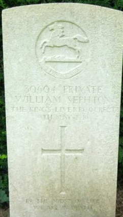 During WW1, William Sephton Snr joined up and was a Private in C Company of the 1st Battalion, The King’s Liverpool Regiment. Sadly, he was killed in action in France on 4th May 1916 aged only 33 years. He was buried in grave A16 at Bruay Communal Cemetery, France. He is also remembered on the family gravestone in Christ Church graveyard, Aughton.