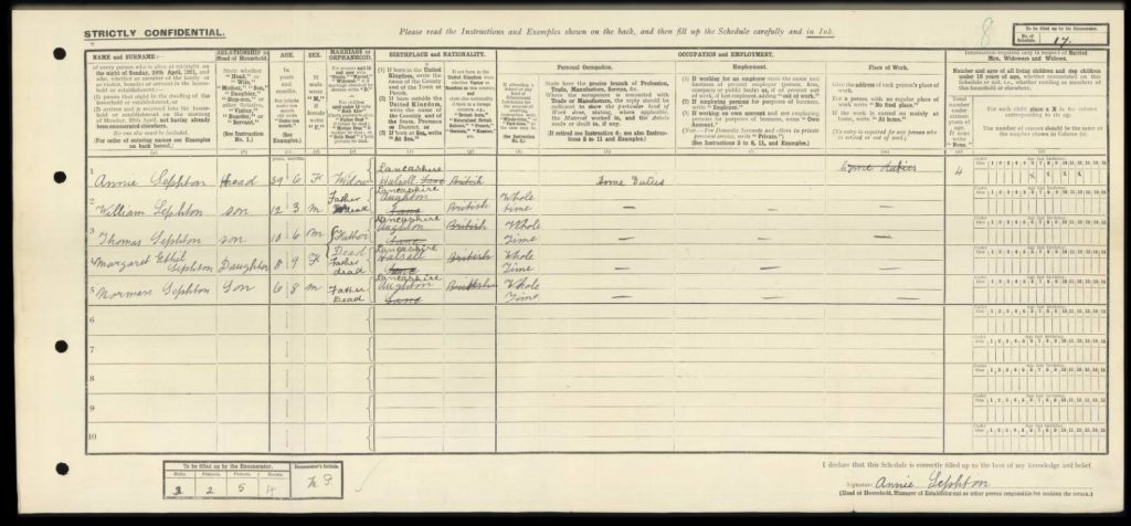 In 1921, Annie and her family were still living at 15 Halsall Lane; the children attended school and Annie carried out home duties as well as looking after her children.