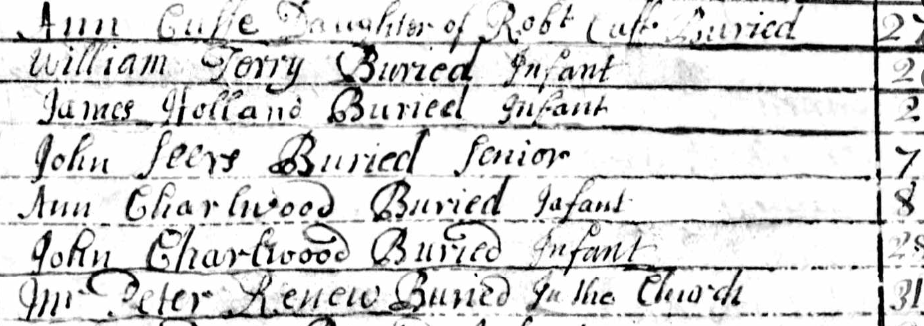 Pierre Reneu had died just a couple of years earlier and must have been a person of some notoriety and/or wealth as he was buried inside St. Mary’s church as can be seen in the burial records.