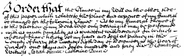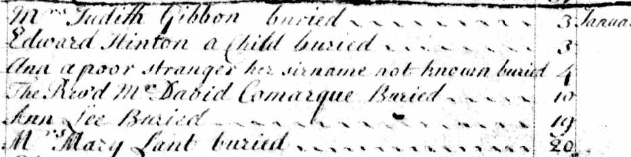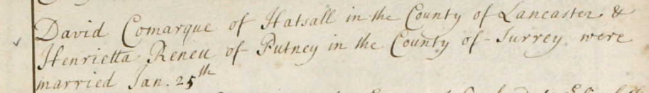 The year 1746 was a devastating year for the Comarque family; their baby, John passed away in September and Reverend David fell ill later that year. He made his will on 6th December in which, amongst other requests, he asked that his funeral be performed with ‘frugality’. In January 1747, Reverend David Comarque died; he was buried on 10th January at St. Mary’s church, Putney, Surrey.